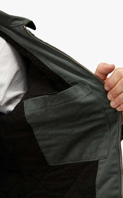 The Modular Jacket is constructed from 8.8 oz Denison twill, which is a midweight poly-cotton fabric. This style is lined with cotton poplin fabric in a diamond-quilted design at the body, and nylon at the sleeves. It is finished with two side pockets, an adjustable hem and cuffs, and a zip front fastening.